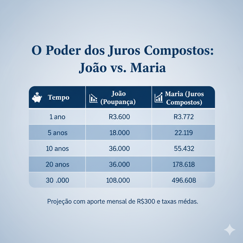 Vamos comparar duas pessoas, "João o Poupador" e "Maria a Investidora". Ambos guardam R$ 300 por mês.